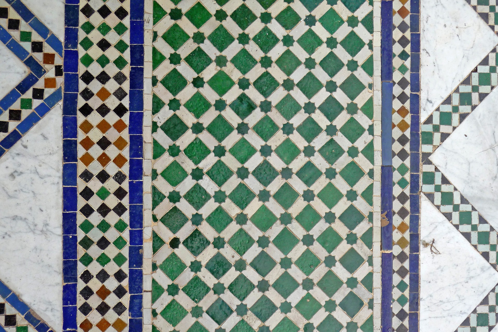 A team of local craftsmen painstakingly restored and transformed the grand house. Walls and ceilings were rebuilt then plastered in colourful tadelakt; traditional lattices were carved from cedar wood. A pool was carefully dug out and decorated with gorgeous mosaic tiles; tiny palms were planted in the open-air courtyards.